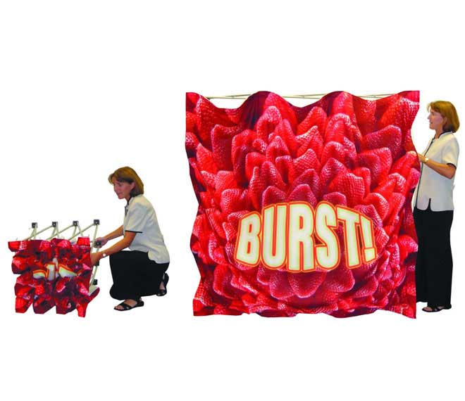 Your BURST fabric mural unfolds with the pop-up frame and stretches to form a seamless image across the entire display. Also available in 10 foot and tabletop systems. Weighs only 24 pounds