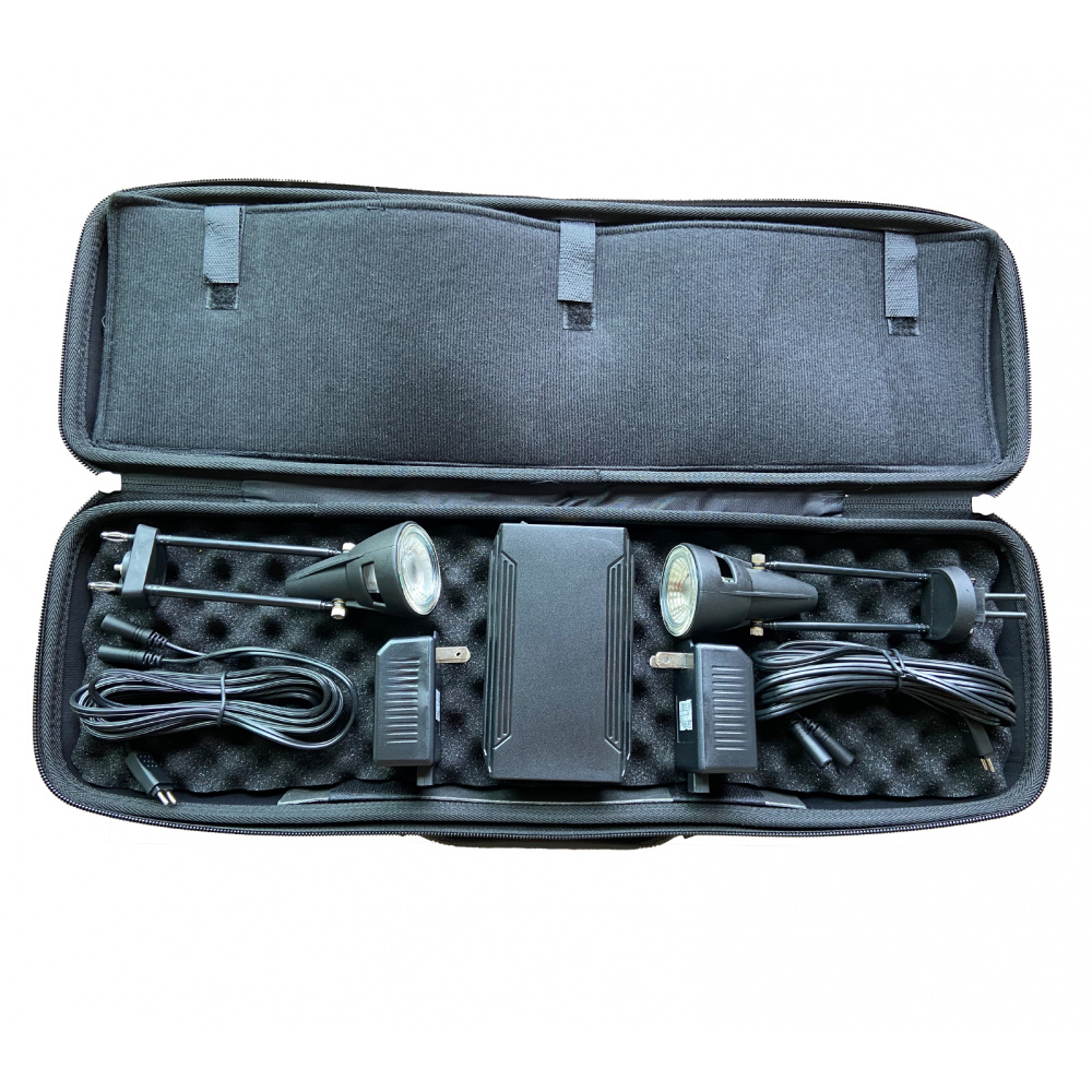 Includes: (2) 6 watt LED Lights, cords, transformers, canvas case and our NEW battery pack.